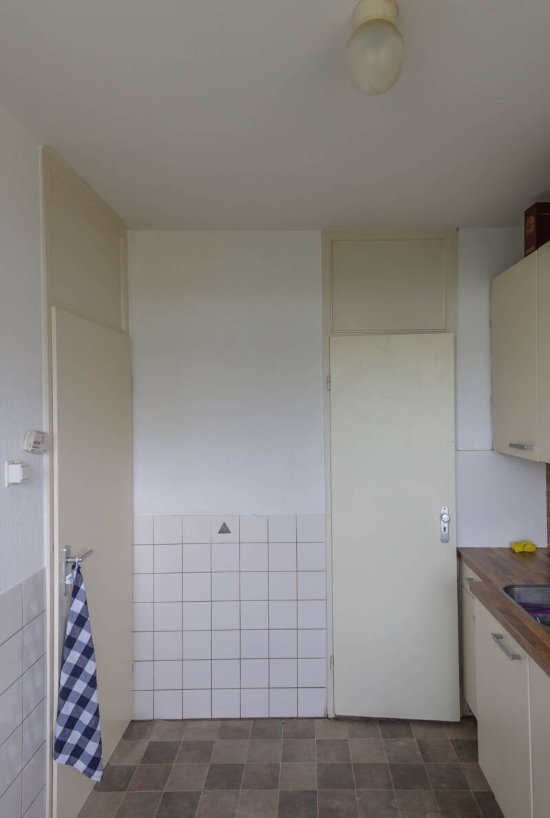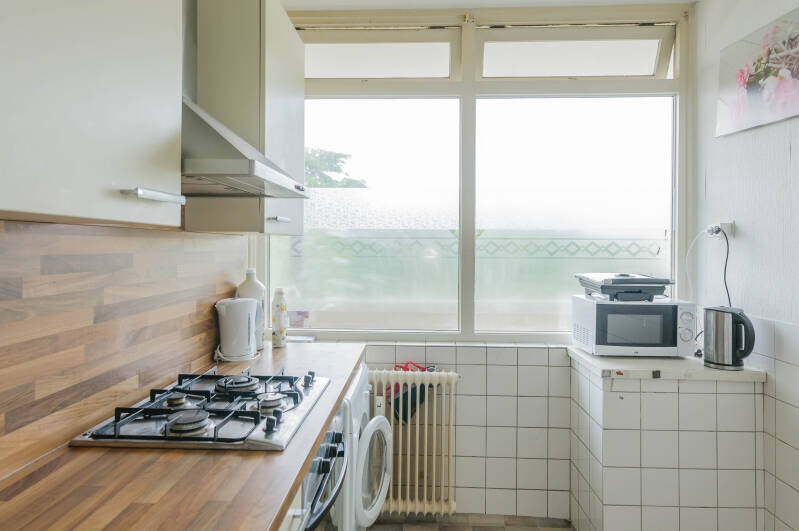 Nette keuken met muurkast, spoelbak en apparatuur zoals: 4-pits gaskookplaat, afzuigkap, oven en koelkast.