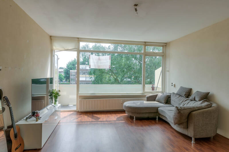 Woonkamer (ca. 22m) met laminaatvloer, muurkast, spachtelputz wanden en aangrenzend balkon (ca. 4.30m x 1.10m).